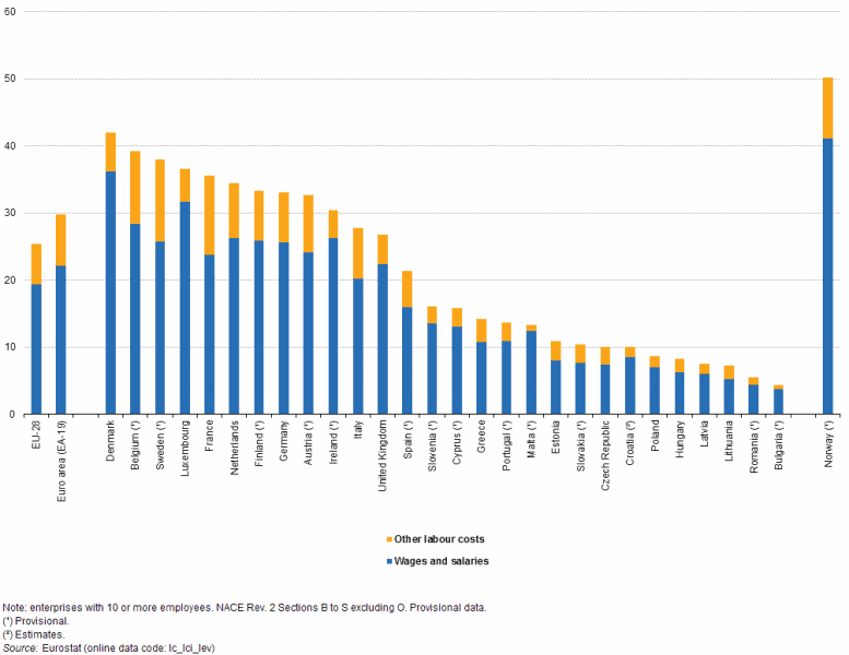 Naime, radnici u deset istočnih zemalja EU-a zarađuju tek 18 i 42 posto plaća na zapadu (Bugarska 18 posto, Estonija 42 posto). Slovenija je jedina “istočna članica EU-a” u kojoj radnici zarađuju više od polovice (60 posto) prosječne plaće EU 15. Hrvatski je radnik lani spada među najslabije plaćene radnike po satu u EU. Što se tiče ostalih troškova rada – ni tu nije prednjačio. Na njegovu nadnicu išao je europski prosječno velik udio doprinosa: upadljivo manji bilježe Malta, Irska, Bugarska i bogati Luksemburg – inače europski šampion minimalne plaće u eurskoj vrijednosti.