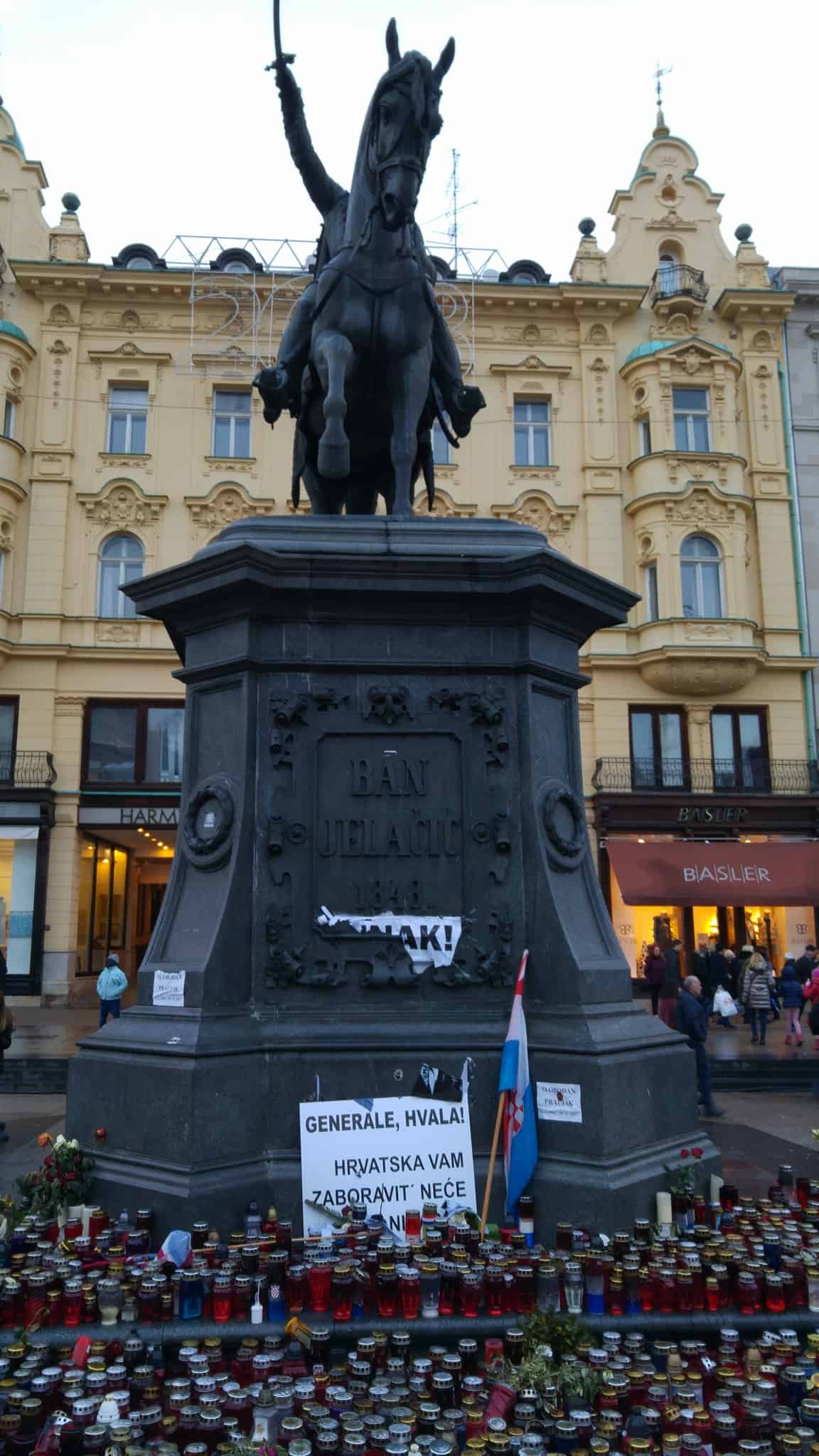 EDIT: Oko sat vremena nakon objave ovog teksta, na kip bana Josipa Jelačića na glavnom zagrebačkom trgu ponovo je postavljen plakat s likom Slobodana Praljka, oko kojeg se skupljaju novi lampioni.