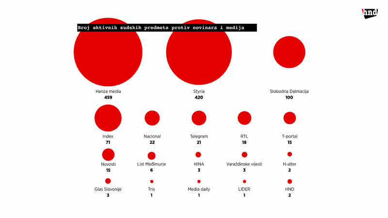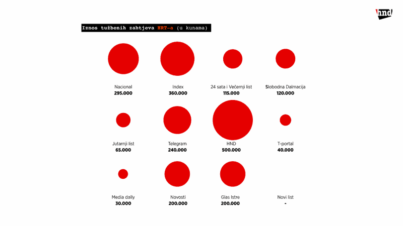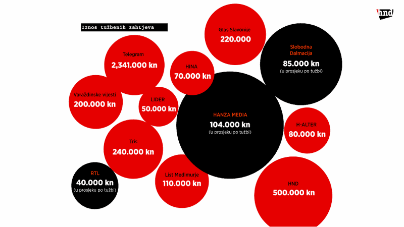 Poseban je problem HRT koji je do vremena kad se pripremao skup podignuo ukupno 33 tužbe protiv raznih medija te same strukovne organizacije i njenog predsjednika Hrvoja Zovka, da bi se na dan održanja skupa tom broju pridružila i 34. tužba, s ukupnim odštetnim zahtjevima od 2,192.500 kuna. Koliko je situacija s HRT-om apsurdna pokazuje i podatak da je HND na svojoj web strani pokrenuo brojač tužbi HRT-a jer pristižu na dnevnoj bazi.