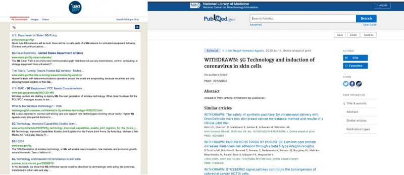 Naime, stranica američke Vlade usa.gov koristi tražilicu Bing, koja pretragom pojma “5G” izbacuje i sporni članak objavljen na stranici PubMed – “5G tehnologija i indukcija koronavirusa u stanicama kože”. PubMed također ima ekstenziju .gov zbog čega tražilica izbacuje i ovo istraživanje, koje je u međuvremenu povučeno.