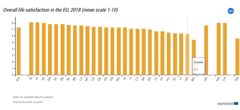 Na ljestvici općeg životnog zadovoljstva koja se mjeri od 1 do 10, Hrvatska ostvaruje rezultat od 6.4, a iza nas je i u ovom slučaju samo Bugarska.