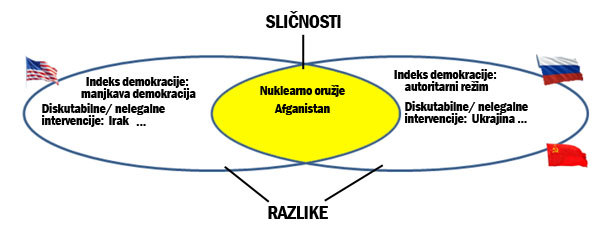 I SAD i Sovjetski Savez su, pokazao bi zorno takav dijagram, slični po tome što su intervenirali u Afganistanu (Sovjeti 1979 – 1989) te što Amerika i Rusija posjeduju nuklearno naoružanje. Razlikuju se pak po stupnju demokratičnosti i po područjima u kojima su vojno intervenirali bez većinskog pristanka međunarodne zajednice. Ako krenete nabrajati gdje su i što sve te države činile od Drugog svjetskog rata naovamo, mogli biste se brzo umoriti jer liste su podugačke, a ljudske se žrtve mjere u velikim i nikad točno utvrđenim brojevima. U tome i leži zamka ovih rasprava jer klupko je teško razmrsiti, podvući crtu i doći do kakvog takvog zaključka, bez da se upadne u whatabautism vrtlog.Tko god želi beskonačno prebacivati ping pong lopticu s nabrajanjem pravih i hibridnih ratova moći će, među ostalim, navesti Amerikance u Afganistanu (2001-2021) i Iraku (2003-2011), rusko razaranje čečenskog grada Grozni (završilo 2000), upadanje u Gruziju (2008) i osvajanje Krima (2014).