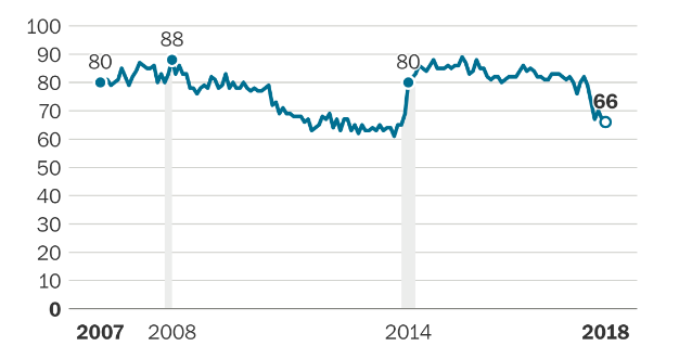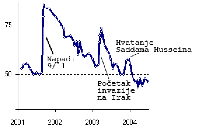 Niti u Sjedinjenim Državama raspoloženje građanstva nije ništa drugačije jer pokazivanje vojničkih mišića gotovo u pravilu donosi veću popularnost. G.W.H. Bush stariji (predsjednik 1989-1993) uživao je veliku podršku nakon invazije Paname 1989. godine te trijumfalne postotke pobjedom u Zaljevskom ratu 1991. godine, dočim je njegov sin G.W. Bush (predsjednik 2001-2009) skupio dodatne bodove invazijom na Irak i hvatanjem svrgnutog iračkog predsjednika Sadama Husseina, što je ilustrirano u donjem grafikonu.