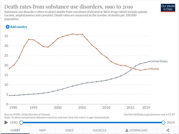 Prema podacima Our World in Data, Rusija se približava zemljama tzv. Zapada tek kada se ovisnostima o drogama doda i alkohol. Smrtnost od alkohola visoka je diljem istočne Europe, dok je broj smrtnih slučajeva od ilegalnih droga visok u cijeloj Sjevernoj Americi.