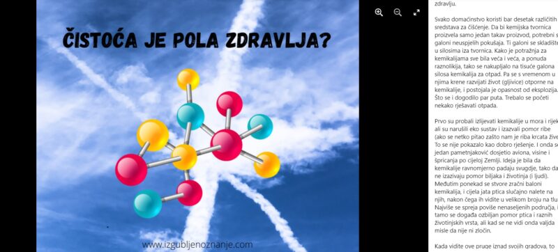 “Uglavnom, nije riječ o borbi protiv globalnog zatopljenja i UV zračenja, već nečija brilijantna ideja kako se riješiti kemijskog otpada, i usput još više obogatiti one koji bi trebali brinuti o našem zdravlju. Svako domaćinstvo koristi bar desetak različitih sredstava za čišćenje. Da bi kemijska tvornica proizvela samo jedan takav proizvod, potrebni su galoni neuspjelih pokušaja. Ti galoni se skladište u silosima iza tvornica. Kako je potražnja za kemikalijama sve bila veća i veća, a ponuda raznolikija, tako se nakupljalo na tisuće galona silosa kemikalija za otpad. Pa se s vremenom u njima krene razvijati život (gljivice) otporne na kemikalije, i postojala je opasnost od eksplozija. Što se i dogodilo par puta. Trebalo se početi nekako rješavati otpada…I onda se jedan pametnjaković dosjetio aviona, visine i špricanja po cijeloj Zemlji. Ideja je bila da kemikalije ravnomjerno padaju svugdje, tako da ne izazivaju pomor biljaka i životinja (i ljudi)”, stoji u statusu na Facebooku.