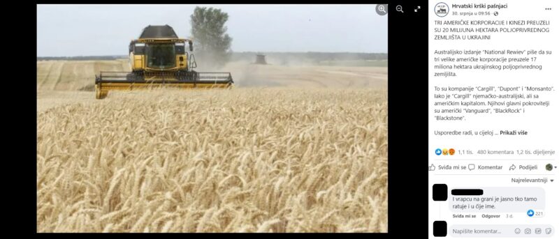 “Australijsko izdanje “National Rewiev” piše da su tri velike američke korporacije preuzele 17 milijuna hektara ukrajinskog poljoprivrednog zemljišta”, stoji na početku statusa objavljenog 30. srpnja.