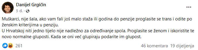 “Muškarci, nije šala, ako vam fali još malo staža ili godina do penzije proglasite se trans i odite po ženskim kriterijima u penziju. U Hrvatskoj niti jedno tijelo nije nadležno za određivanje spola. Proglasite se ženom i iskoristite te novo normalne gluposti. Kada se oni već glupiraju podarite im glupost”, stoji u njegovoj Facebook objavi.