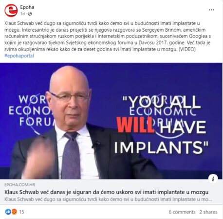 “Klaus Schwab već danas je siguran da ćemo uskoro svi imati implantate u mozgu”, naslov je teksta (arhivirano ovdje) objavljenog na portalu Epoha, za koji je Faktograf u više navrata utvrdio da širi dezinformacije.