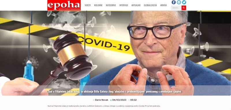 “Sud u Filipinima izdao nalog za uhićenje Billa Gatesa zbog ‘ubojstva s predumišljajem’ povezanog s uvođenjem cjepiva”, naslov je članka (arhiviran ovdje), objavljenog na rubnom portalu Epoha za kojega je Faktograf.hr u više navrata ustvrdio da širi dezinformacije.