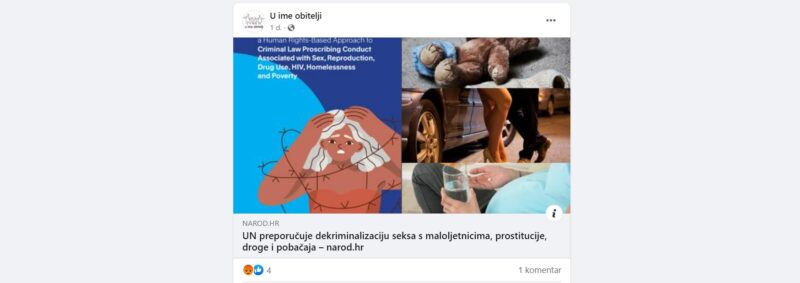 Portal Narod.hr 19. travnja objavio je članak s naslovom “UN preporučuje dekriminalizaciju seksa s maloljetnicima, prostitucije, droge i pobačaja” (arhivirano ovdje), a link na tekst je na svom Facebook profilu podijelila udruga U ime obitelji (arhivirano – ovdje), izdavač portala Narod.hr.