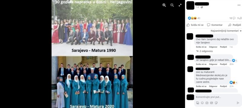 Na kolaž je dodan natpis: 30 godina napretka u Bosni i Hercegovini. Uz prvu fotografiju pritom piše: “Sarajevo – Matura 1990”, a uz drugu: “Sarajevo – Matura 2020”.