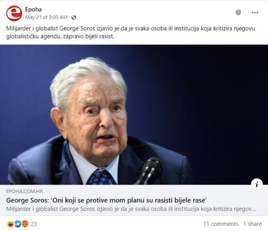 George Soros: ‘Oni koji se protive mom planu su rasisti bijele rase’”, naslov je teksta (arhivirano ovdje) objavljenog na portalu Epoha za koji je Faktograf u više navrata utvrdio da širi dezinformacije.