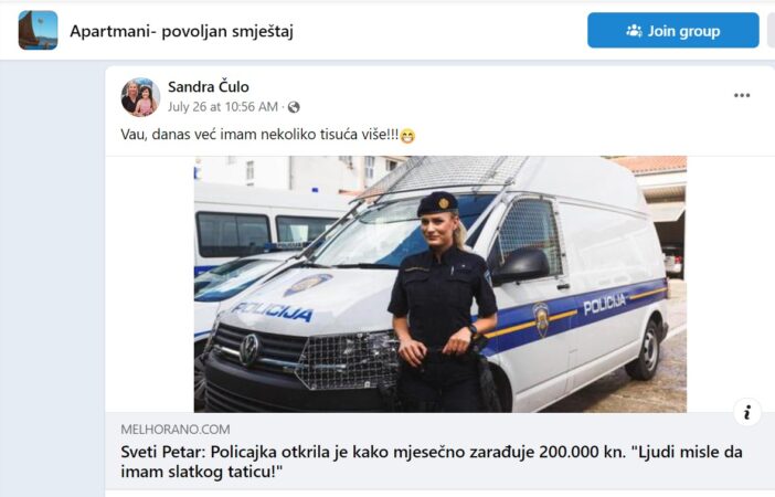 “Valpovo: Policajka otkrila je kako mjesečno zarađuje 200.000 kn. “Ljudi misle da imam slatkog taticu!”, naslov je članka (arhivirano ovdje) objavljenog na stranici melhorano.com.