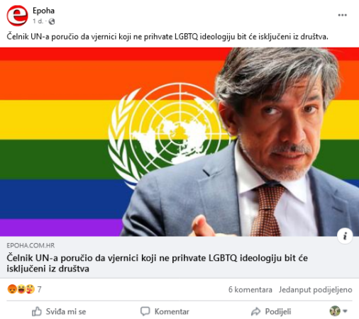 Tvrdnja je to kojom počinje tekst objavljen na portalu Epoha.com.hr, učestalom širitelju dezinformacija i raznih teorija zavjere. U tekstu koji je naslovljen “Čelnik UN-a poručio da će vjernici koji ne prihvate LGBTQ ideologiju biti isključeni iz društva” navode se potom i sljedeće teze:
