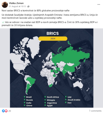 Isto se odnosi i na snažan rast BDP-a novih zemalja BRICS-a. Činit će 30% svjetskog BDP-a i premašit će 30 trilijuna dolara”, stoji u javnoj objavi korisnice Facebooka (arhiviranoj ovdje).