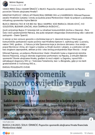 “U emisiji se bez cenzure govorilo o zločinima koje je 5. slavonski korpus Titove jugo-komunističke partizanske vojske počinio nad Hrvatima tijekom II. svjetskog rata i u poraću, nakon 1945. godine… U fokusu je bila Španovica koja je doslovce zbrisana s lica zemlje – poput Borićevca i Zrina, ali i logori u kojima su Hrvati mučeni i ubijani”, dio je podužeg statusa objavljenog 3. listopada 2023. godine.