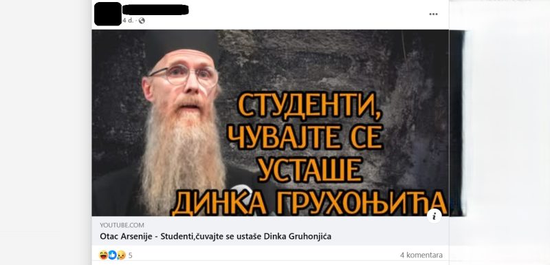 Besjeda oca Arsenija, monaha iz manastira Ribnica, ponovljene su poznate optužbe na račun profesora Dinka Gruhonjića, a dijelovi njegovog govora objavljeni na Youtube kanalu Ortodox dijele se putem društvenih mreža uz naslov: “Studenti, čuvajte se ustaše Dinka Gruhonjića”. Monahovu besjedu – u kojoj se Gruhonjiću poručuje da ide iz Srbije ako mu se ne sviđa – promovirao je i režimski Pink (arhivirano ovdje), čija je vijest također distribuirana putem društvenih mreža (arhivirano ovdje).