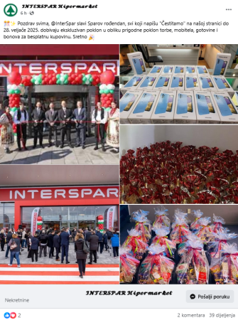 “🎊✨ Pozdrav svima, @InterSpar slavi Sparov rođendan, svi koji napišu “Čestitamo” na našoj stranici do 28. veljače 2025. dobivaju ekskluzivan poklon u obliku prigodne poklon torbe, mobitela, gotovine i bonova za besplatnu kupovinu. Sretno 🎉“, sadržaj je posta objavljenog 25. veljače 2025. godine na stranici INTERSPAR Hipermarket (arhiviran ovdje).