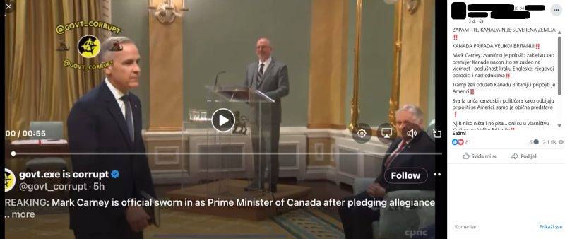 Korisnik Facebooka objavio je video prisege kanadskog premijera Marka Carneya, točnije onaj dio prisege u kojem se izražava odanost britanskom kraljevstvu, odnosno kralju Charlesu III.