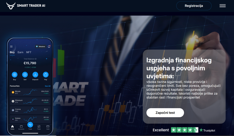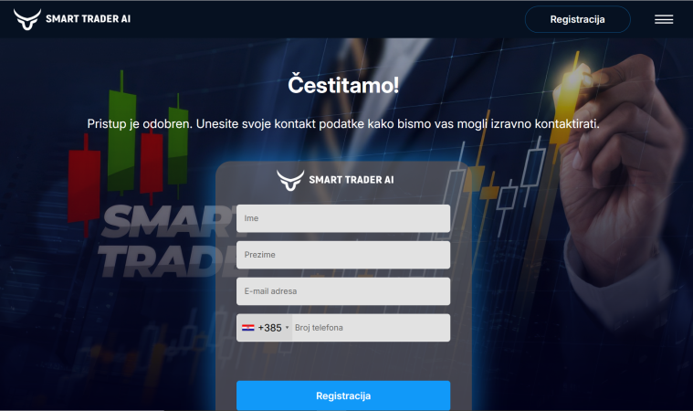 Oglas nudi poveznicu na stranicu “SmartTrader AI” na kojoj je potrebno ispuniti kratki “upitnik” i odgovoriti na pitanja poput kako ste saznali za stranicu i koliko sredstava mislite uložiti.