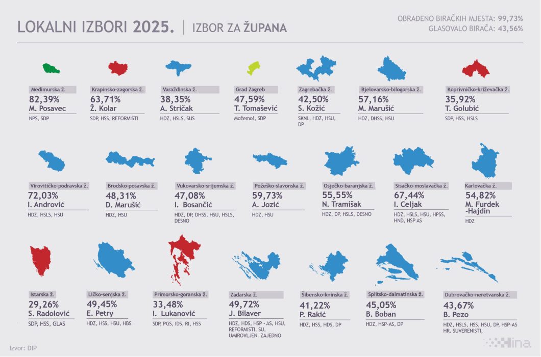 Županijski izbori tako su završeni u Karlovačkoj, Krapinsko-zagorskoj, Sisačko-moslavačkoj, Virovitičko-podravskoj, Bjelovarsko-bilogorskoj, Međimurskoj, Osječko-baranjskoj i Požeško-slavonskoj županiji.