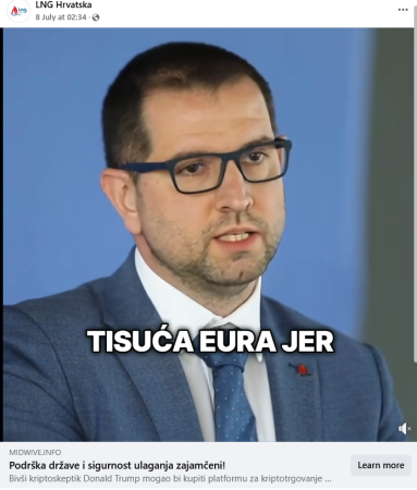 Trenutno se širi još jedan video oglas (arhiviran ovdje) u kojem se pojavljuje direktor LNG-a Hrvatska Ivan Fugaš. Snimka je generirana alatima umjetne inteligencije i ne predstavlja stvarnu Fugaševu izjavu. U toj lažnoj izjavi on govori:
