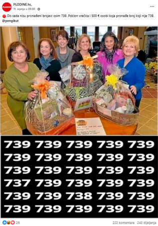 Gornji dio slike iz posta prikazuje šest žena koje stoje iza stola na kojem su postavljene poklon košare s ukrasnim celofanom. Pretpostavlja se da su te košare nagrade u sklopu nagradne igre spomenute u objavi. Donji dio slike sadrži niz brojeva “739” ponovljenih više puta u bijeloj boji na crnoj pozadini. Cilj je pronaći broj koji nije 739.