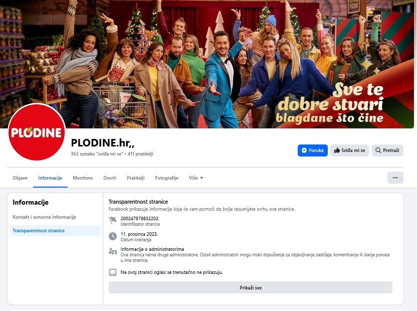 Facebook stranica lažnih Plodina kreirana je 11. prosinca 2023. godine, a ima 411 pratitelja. Za usporedbu, službena stranica Plodina na Facebooku ima preko 225 tisuća pratitelja, a kreirana je 2015. godine. Objave na službenoj stranici su redovite i nagradne igre nisu jedini sadržaj.