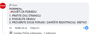 Objava je dizajnirana kao izazov za korisnike društvenih mreža, vjerojatno s ciljem povećanja angažmana, u čemu su administratori i uspjeli jer post sadrži preko 240 dijeljenja. U komentarima su ostavljene daljnje upute stranice “PLODINE.hr,,”