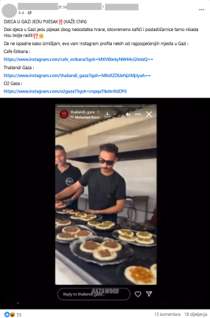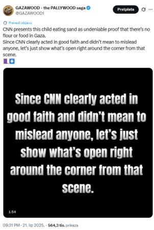 “CNN predstavlja ovo dijete koje jede pijesak kao nepobitan dokaz da u Gazi nema brašna ni hrane. Budući da je CNN očito djelovao u dobroj vjeri i nije namjeravao nikoga zavarati, pokažimo samo što se nalazi odmah iza ugla te scene“, stoji u engleskim natpisima videa s društvenih mreža.