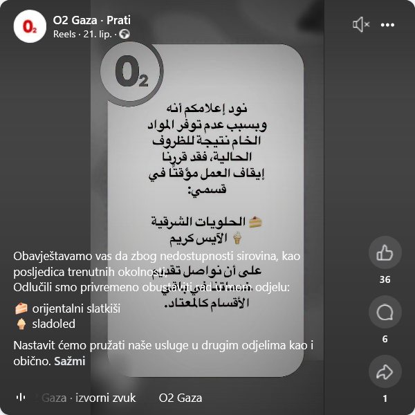 Na upit se odazvao samo jedan, “O2 Gaza”. “Nažalost, mjesto je zatvoreno već neko vrijeme”, kratko su napisali. Na svojoj su Facebook stranici 21. lipnja napisali: “Želimo vas obavijestiti da smo zbog nedostupnosti sirovina uzrokovanih trenutnim okolnostima, odlučili privremeno obustaviti rad u sljedećim odjelima: orijentalni slatkiši i sladoled. U preostalim odjelima nastavit ćemo pružati usluge kao i obično”.