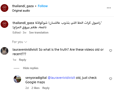 Napomenuo je da nijedno jelo prikazano u videu trenutno nije na njihovom meniju te da služe jedno od 35 jela s menija: palačinke jer je to jedino jelo koje se može napraviti od dostupnih sastojaka na tržištu – šećera i brašna. Dodao je da su cijene drastično skočile te da su kupci “neki od najbogatijih ljudi u Gazi”.