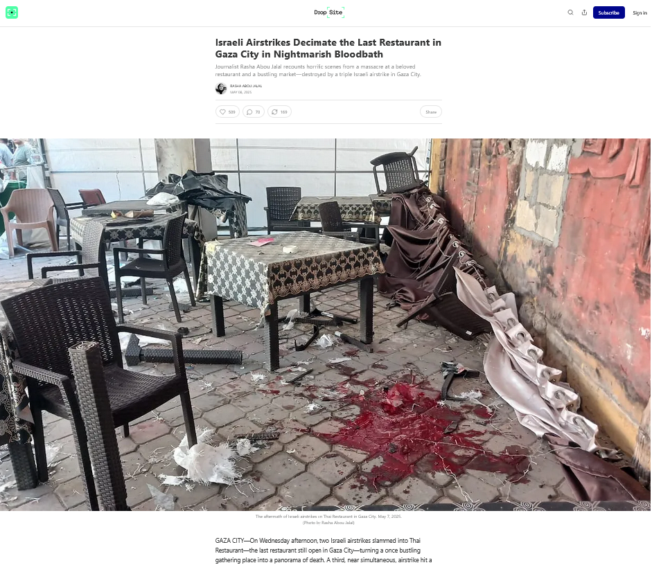 Što se tiče restorana “Thailandi Gaza”, moguće je da je upravo taj bio mjesto masovnog ubojstva Palestinaca u svibnju ove godine. Prema medijskim izvještajima (1, 2), najmanje 33 Palestinaca tada su ubijena, a deseci su ranjeni u dva izraelska napada na prepuni restoran i tržnicu u četvrti Rimal, u gradu Gazi.