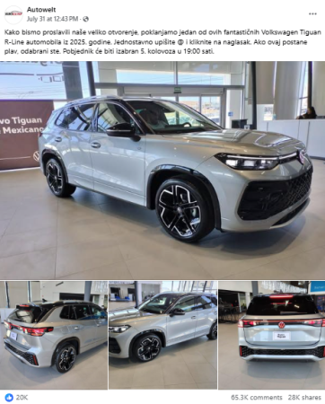 Kako bismo proslavili naše veliko otvorenje, poklanjamo jedan od ovih fantastičnih Volkswagen Tiguan R-Line automobila iz 2025. godine. Jednostavno upišite @ i kliknite na naglasak. Ako ovaj postane plav, odabrani ste. Pobjednik će biti izabran 5. kolovoza u 19:00 sati, stoji u objavi od 31. srpnja na Facebook stranici Autowelt.