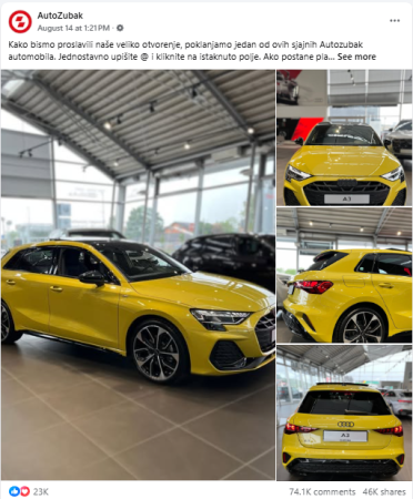 Početkom ovog mjeseca pisali smo o dvije lažne nagradne igre u kojima su se korisnicima kao nagrade obećavali novi automobili, a posljednjih dana na društvenim mrežama u Hrvatskoj strelovito se proširila navodna nagradna igra u kojoj poznata automobilska kuća AutoZubak “povodom otvorenja poklanja” automobil.