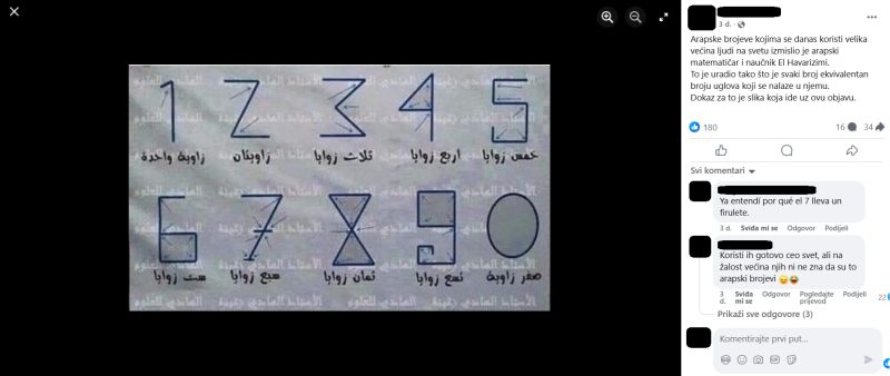 “Arapske brojeve kojima se danas koristi velika većina ljudi na svijetu izmislio je arapski matematičar i naučnik El Havarizimi. To je uradio tako što je svaki broj ekvivalentan broju uglova koji se nalaze u njemu. Dokaz za to je slika koja ide uz ovu objavu”.
