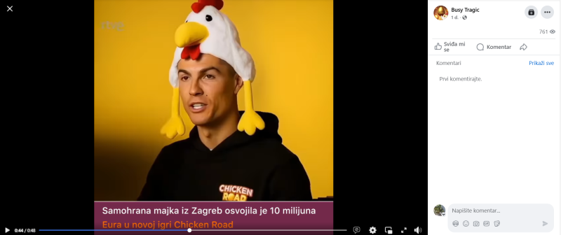 Dakle, u navedenoj reklami za, vjerojatno lažnu verziju, igre Chicken Road netočno se navodi da je samohrana majka iz Zagreba osvojila 10 milijuna eura. Ista ta zagrebačka samohrana majka pojavljuje se i u francuskoj inačici iste reklame. Potom, Cristiano Ronaldo nije razvio tu kockarsku igru, nego ju je razvio InOut Games Studio, nezavisni developer specijaliziran za instant-play casino igre. Na internetu ne postoji niti relevantni izvor da Ronaldo reklamira tu igru.