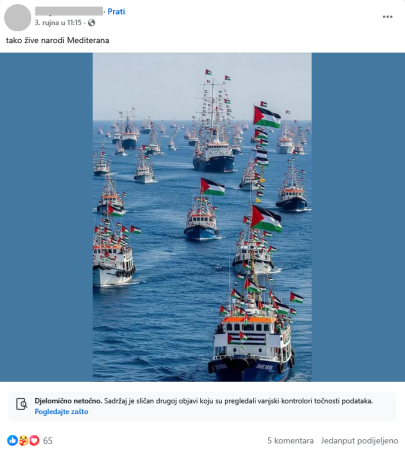 Pored takvih, stvarnih i autentičnih, provuku se i neke koje nisu zaista nastale na moru ili obali Mediterana, nego su plod umjetne inteligencije. Početkom mjeseca internetom se proširila fotografija za koju se tvrdi da prikazuje Globalnu flotilu za Gazu Sumud (GSF). Podijelio ju je i domaći korisnik Facebooka.
