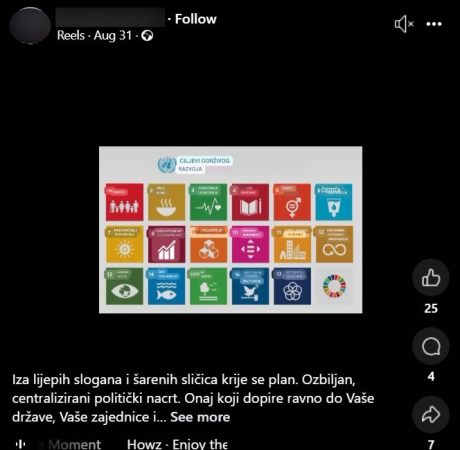 Društvenim se mrežama ponovno proširila pogrešna interpretacija UN-ove Agende održivog razvoja do 2030. Korisnica Facebooka napisala je opširan status uz video koji je objavila (arhiviran ovdje), a u njemu tvrdi da se “iza lijepih i šarenih sličica krije plan”: