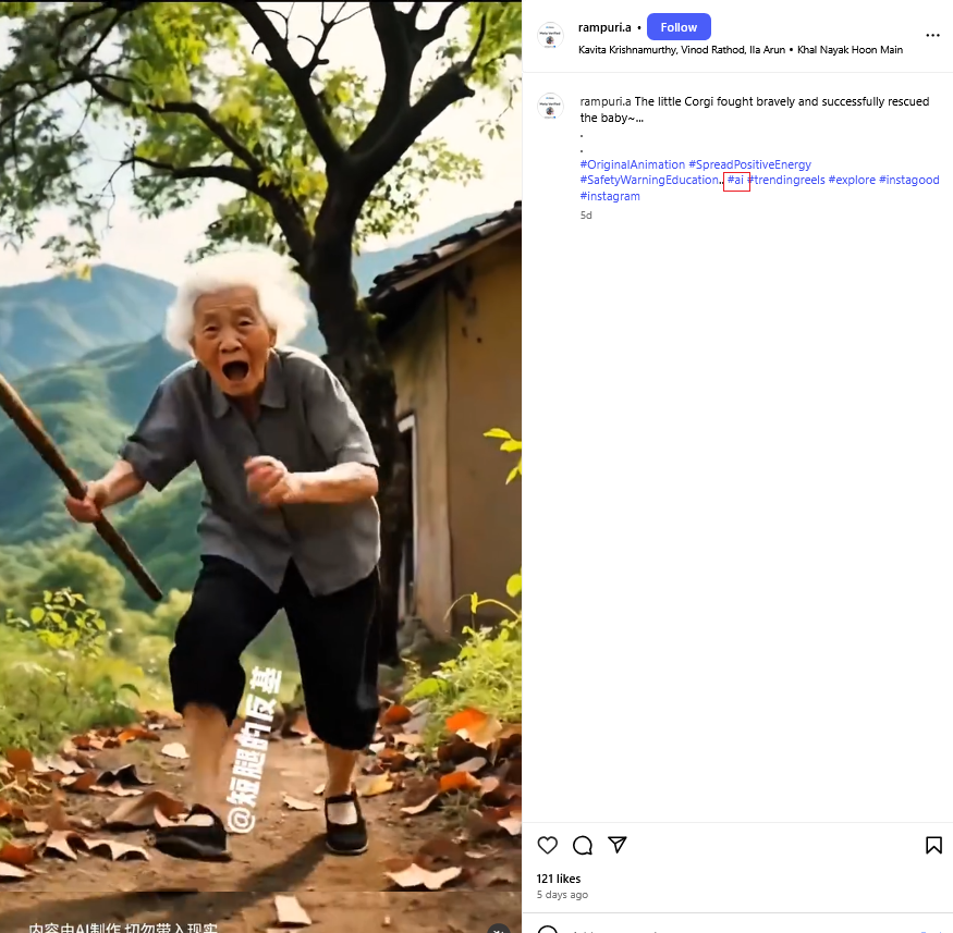 Inače, u video je ubačen vodeni žig Instagram-profila “rampuri.a“. Profil je lociran u Indiji, a u opisu mu stoji “artist”. Sadržaji koje dijeli slični su analiziranom videu: dirljivi, a nerealni prizori iz životinjskog svijeta (1, 2, 3, 4). Za neke od tih uradaka naznačio je da su kreacija AI-ja (1, 2).