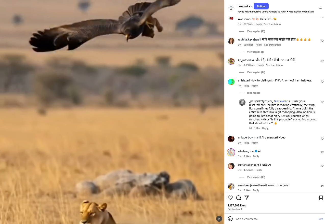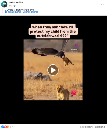 Pored toga neki su pratitelji ovog profila u komentarima ispod videa lavice i orla pisali kako je riječ o AI-ju. “Ptica se kreće nepravilno, vrhovi krila ponekad potpuno nestaju. U jednom trenutku cijela se ptica pomiče poput gifa koji se ponavlja. Također, nijedan lav neće skočiti tako visoko. Samo se zapitajte dok gledate videozapise ‘je li ovo vjerojatno? miče li se išta što se ne bi trebalo micati?'”, napisao je jedan korisnik.