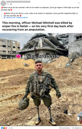 “Nakon sto je vec bio raznesen vratio se da nastavi sa ubijanjem, jutros ga snajper iz Rafe salje na put bez povratka“, tekstualni je sadržaj posta objavljenog na Facebooku 20. rujna 2025. godine (arhiviran ovdje).