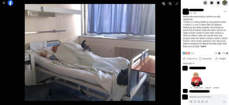 U cijelom statusu autentična je samo dirljiva fotografija, dok je priča o navodnoj medicinskoj sestri “fotografkinji”, obitelji koja ne posjećuje pacijenta, kao i učestalim dolascima vjernog goluba, nastala kroz napuhavanje priče na društvenim mrežama.