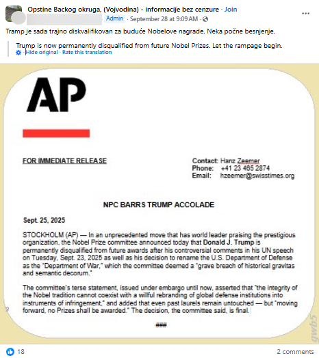 Društvenim mrežama u regiji proširila se, pak, informacija (arhivirano ovdje) da je Trump trajno diskvalificiran za dobivanje Nobelove nagrade, a kao “dokaz” je objavljeno navodno priopćenje novinske agencije Associated Press. U opisu se navodi sljedeće: “Tramp je sada trajno diskvalifikovan za buduće Nobelove nagrade. Neka počne besnjenje”.