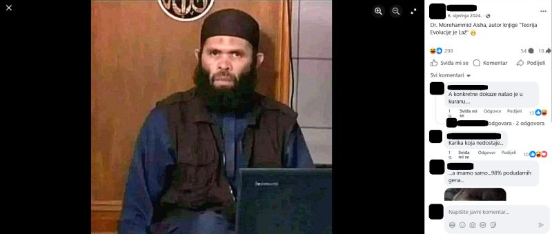 Čovjek s fotografije kao autor knjige “Teorija evolucije je laž” predstavljan je i među korisnicima društvenih mreža na drugim govornim područjima (arhivirano ovdje i ovdje).