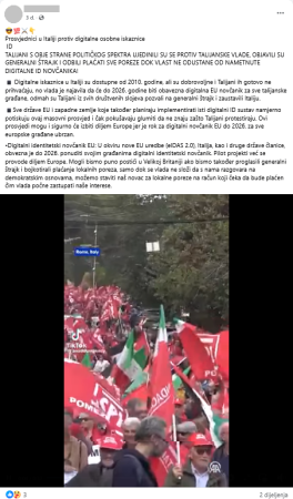 ◾️Sve države EU i zapadne zemlje koje također planiraju implementirati isti digitalni ID sustav namjerno potiskuju ovaj masovni prosvjed i čak pokušavaju glumiti da ne znaju zašto Talijani protestiraju. Ovi prosvjedi mogu i sigurno će izbiti diljem Europe jer je rok za digitalni novčanik EU do 2026. za sve europske građane ubrzan.
