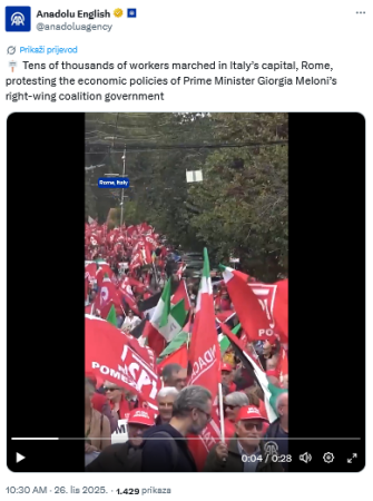 Snimku je 26. listopada na svojim društvenim mrežama objavila turska medijska agencija Anadolija (1, 2). “Deseci tisuća radnika marširali su u talijanskom glavnom gradu Rimu, prosvjedujući protiv ekonomske politike desničarske koalicijske vlade premijerke Giorgie Meloni“, stoji u opisu tih postova.