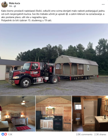 Uz lažne nagradne igre trgovačkih lanaca, jedna od uvjerljivo raširenijih prevara na društvenim mrežama jest i ona u kojima se dijele montažne mobilne kuće. Facebook stranice pod nazivom “Mala kuća” pojavljuju se svako toliko, a iako smo na ovakve prevare višekratno upozoravali gotovo svaki put one postaju viralne. Posljednja u nizu počela se širiti kvartovskim grupama, gdje smo je i mi uočili. U najnovijoj iteraciji (arhivirano ovdje) ove lažne nagradne igre male kuće dijele se “povodom Božića”: