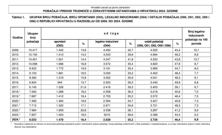 Prijave svih vrsta pobačaja dostavljaju se u Nacionalni javnozdravstveni informacijski sustav (NAJS) i ondje je u 2024. prijavljeno 5.549 pobačaja, što predstavlja porast od 0,5 % u odnosu na broj zabilježen prethodne godine (5.520 pobačaja). HZJZ je u tu brojku uključio i 2.484 pobačaja koji nisu prijavljeni unatoč zakonskoj obavezi, ali su evidentirani u Bazi podataka o hospitalizacijama unutar sustava NAJS.