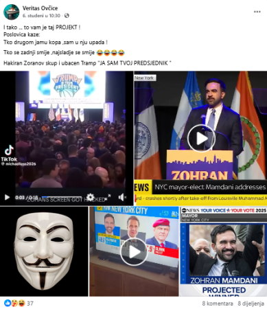 Hakiran Zoranov skup i ubacen Tramp ‘JA SAM TVOJ PREDSJEDNIK’“, stoji u Facebook postu objavljebom 6. studenog 2025. godine (arhiviran ovdje).